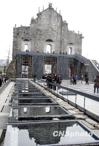 图为游客在澳门大三巴牌坊观光游览。中新社发 张勤 摄