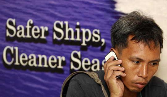 在马尼拉的海岸警卫队总部,事发船只乘客的亲属用手机打电话。