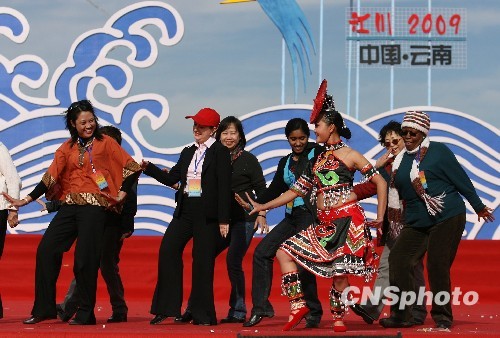 12月24日,多位驻华使节夫人在云南江川举行的开渔节上向傣族姑娘学跳傣族舞。当日,云南江川第五届开渔节开幕,来自20个国家的驻华使节及夫人参加了开幕式。中新社发 苏丹 摄