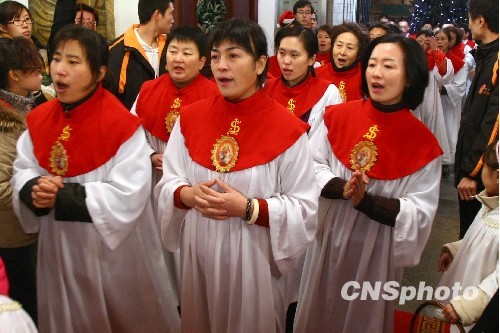 12月24日平安夜,北京王府井教堂灯火辉煌、人头攒动,人们纷纷来到这里欢度平安夜。中新社发 富田 摄