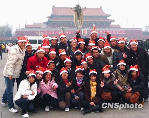 组图:“圣诞老人”团天安门广场快乐留影
