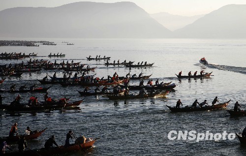 12月25日,中国云南江川第五届“开渔节”开幕,封湖一年的星云湖正式开放捕鱼。星云湖设立“开渔节”至今已有30年的历史,形成了有浓厚地方特色的传统性节日。每逢开渔节,当地渔民全家动员,男子负责入湖捕鱼,女子则在岸边出售刚打捞上岸的鱼类。江川地处滇中腹地,境内有星云湖和抚仙湖两大高原湖泊,已形成有规模的高原湖泊水产品交易市场,年均鱼交易量达一万余吨,交易额上亿元人民币。图为开渔节千舟竞发的壮观景象。中新社发 刘冉阳 摄