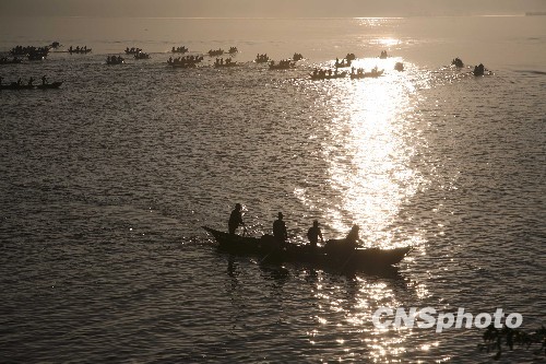 图为前往湖心捕鱼的渔船。中新社发 刘冉阳 摄