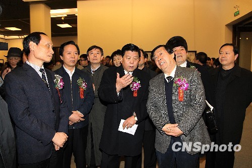 图为中国文联党组书记胡振民(右二) 、中宣部副部长翟卫华(左)、文化部副部长王文章(左二)出席画展开幕式。中新社发 王保胜 摄