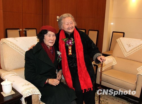 图为徐悲鸿夫人廖静文(左)和李可染夫人邹佩珠出席开幕式。中新社发 王保胜 摄