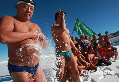 12月26日,众多乌鲁木齐冬泳爱好者在户外零下十几度的雪地里,用白雪擦拭身体,展示健硕身材。当天,新疆乌鲁木齐第七届丝绸之路冰雪风情在该市南郊一滑雪场隆重开幕,众多冬泳爱好者为来宾和四方游客献上一场精彩刺激的冬泳表演。中新社发 刘新 摄