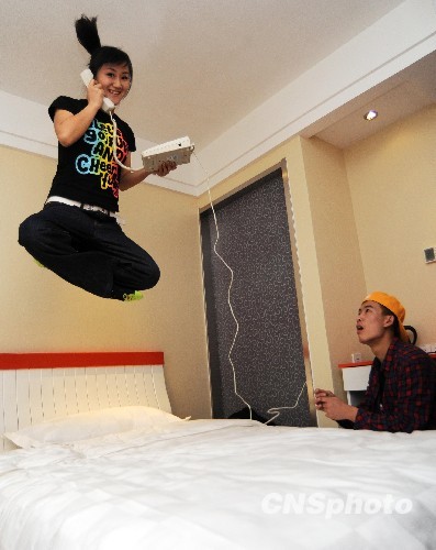 2009年12月26日,山东潍坊年轻人在潍坊一家酒店玩“跳床”。每当周末,山东潍坊“跳床”爱好者就聚集起来玩“跳床”游戏,锻炼身体,减轻工作压力。据活动组织者潍坊领航文化负责人孙志达讲,“跳床”从国外流传而来,能达到锻炼和减压效果。目前,在国内一些城市,“跳床”受到了越来越多人的欢迎。中新社发 王志德 摄