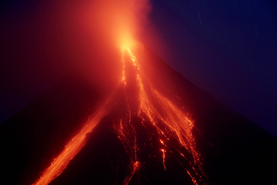 菲律宾马荣火山近来活动明显加剧,持续喷吐火山灰与熔岩,专家认为随时都有大规模喷发的可能。到目前为止已有4.7万民众被迫撤离。图为27日,马荣火山不断喷出火山灰与熔岩。