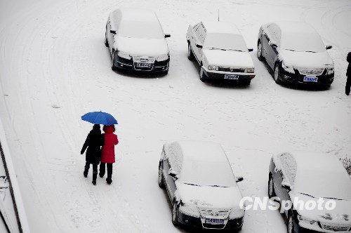 12月27日清晨,受冷空气影响,江苏连云港迎来今冬首场降雪,很多房屋顶上已积起了厚厚一层积雪,而出行的车辆顶棚也戴上了白色的“雪帽”,气温跌至零下4度摄氏度左右,漫天飞舞的雪花给市民出行带来一些不便。中新社发 王春 摄