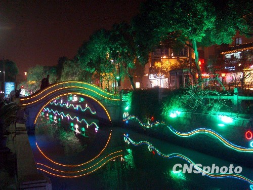 古城苏州街头到处灯光璀璨,霓虹闪烁,一派绚丽多彩的迎新年美景。中新社发 王建康 摄