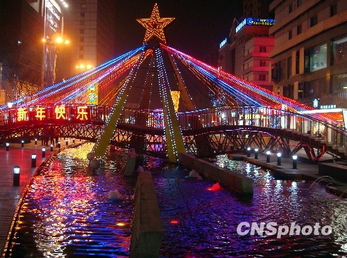古城苏州街头到处灯光璀璨,霓虹闪烁,一派绚丽多彩的迎新年美景。中新社发 王建康 摄