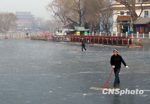 12月28日,在北京什刹海工人们正在对冰场进行最后的清理,迎接2010年1月1日左右冰场的正式开放。
