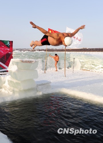 12月31日,黑龙江省黑河市20余名冬泳健儿,冒着零下20多度的严寒,在黑龙江上进行冬泳表演,用挑战自我的特有方式迎接新年到来。