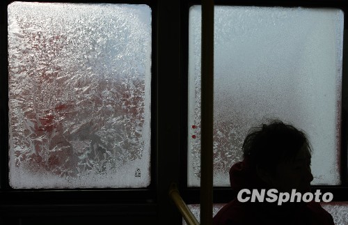1月4日,经过昨天大雪之后,北京终于放晴,随之而来的是大风降温天气。北京白天最高气温降至零下九摄氏度。图为公交车窗上凝结了厚厚的冰花。中新社发 刘震 摄