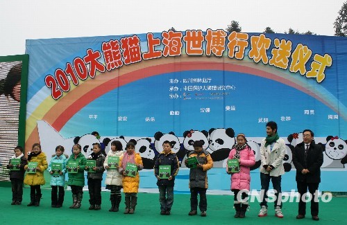 图为欢送仪式上,国家林业局卧龙自然保护区管理局局长张和民(右一)、影星黄晓明(右二)向灾区小朋友赠书。中新社发 王晶 摄