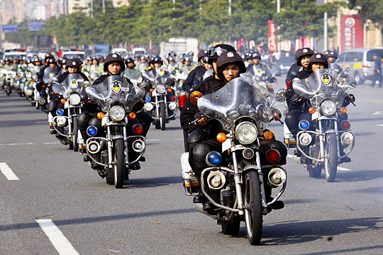1月4日,亚运年的第一个工作日,广东东莞厚街举行了历年来规模最大的一次武装巡游,150多辆警车载着500多名特警、武警、交警、民警、治安队员,亮着警灯在全镇主干道巡游,引来群众驻足观看。