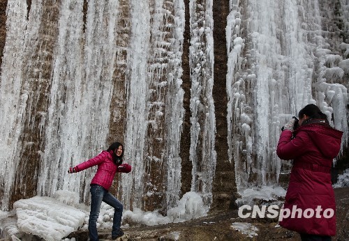 1月5日是二十四节气中的小寒,由于受强冷空气的影响,山东省枣庄市迎来了入冬以来最低气温零下11摄氏度,当地的龙床水库大坝出现晶莹剔透的冰瀑奇观,令游人陶醉其中。中新社发 吉 喆 摄