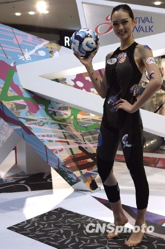人气模特儿Jessica C穿着德国艺术家Andy Maluche 现场绘画的鲨鱼衣亮相,演绎艺术与运动的魅力。中新社发 张勤 摄