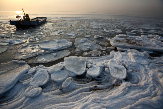 2010年1月12日,河北秦皇岛海冰奇观。最近一段时期,秦皇岛海岸线到处呈现冰封景观。由于我国北方遭遇的罕见低温寒潮天气,河北省秦皇岛地区也遭遇了几十年来少有的寒冷,最低气温在零下20度徘徊。在长长的海岸线上以及著名景点老龙头、鸽子窝、老虎石等岸边都被厚厚的冰雪掩盖,有的地方海面浮冰由岸边向远海处绵延数百米,引得许多市民和游客冒着寒冷前去赏冰玩耍。 周雪峰 摄