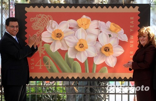 中国农历新年临近,美国邮政总局十四日上午在洛杉矶举行二0一0虎年生肖邮票首发式,总共四千万枚、面值为四十四美分的虎年邮票正式在全美发售。该邮票由出生于香港的华裔艺术家麦锦鸿(Kam Mak)与美国邮政总局艺术总监凯斯勒(Kessler)合作完成。虎年生肖邮票以中国红为底色,主体图案是五朵绽放的水仙花,金色剪纸老虎被置于左上角成为陪衬,麦锦鸿称这样设计是为了减少老虎的霸气,增添节日的喜庆气息。