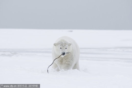 北极熊叼着一根树枝玩耍。