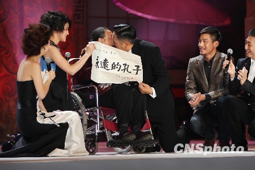 周润发亲吻感谢孔子第77代嫡孙女孔德懋女士。中新社发 王保胜 摄