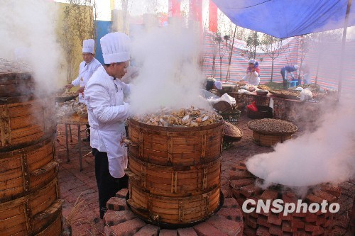 重庆市荣昌县昌州街道办事处石河村,村民在筹办丰盛的百桌刨汤宴。中新社发 朱芸锋 摄