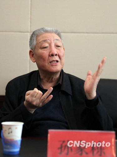 北斗卫星导航系统工程总设计师孙家栋院士向媒体介绍北斗工程建设情况。中新社发 孙自法 摄