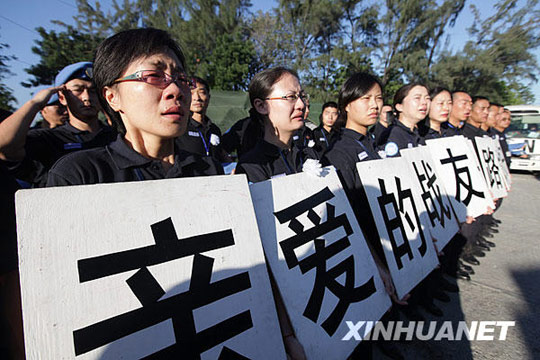 1月17日,在海地太子港,中国驻海地维和部队官兵在营地为战友送行。当日,中国8位在海地地震中遇难人员的遗体将搭乘南方航空公司包机,启航回国。