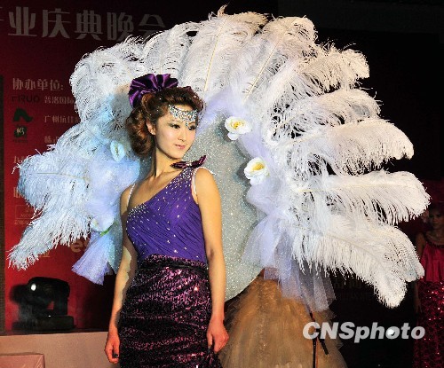 1月17日晚,福州一会所展示时尚婚纱秀,正值婚庆高潮期婚纱秀再现张力,吸引众多准新人。图为模特展示一款市值一万元人民币的一款华丽礼服。中新社发 张丽君 摄