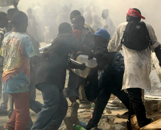 海地地震发生后,因严重缺衣少食,许多不法分子,包括一些饥饿难耐的灾区民众在内,肆意抢夺财物和食品。图为1月17日,在海地首都太子港,一些民众正在抢夺财物。