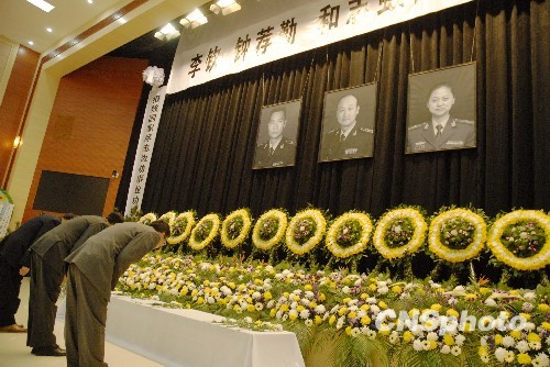 1月18日上午,云南省公安边防总队为在海地强震中遇难的云南三名维和官兵设置灵堂供社会各界悼念。当日上午,该边防总队在此举行了追悼仪式。与此同时,云南4000余公里边防线上所有的基层单位也都以默哀等形式举行悼念活动。图为当日下午,市民前来灵堂吊唁。中新社发 田洪 摄