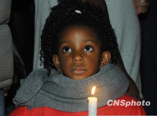 当地时间1月18日,旅美海地人在海地驻美使馆外举行烛光守夜活动,以悼念海地地震中的遇难。图为当日一名海地女孩为地震遇难者祈祷。中新社发 吴庆才 摄