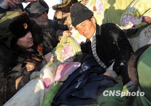 因雪灾被困阿勒泰山区严重冻伤的非法淘金者被救援人员抬下直升机。中新社发 刘新 摄