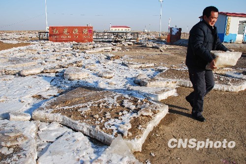 逾十级的渤海“阵风”将最大逾500公斤重的海冰冲上山东东营红光渔港,整个码头被海冰覆盖。中新社发 李波 摄