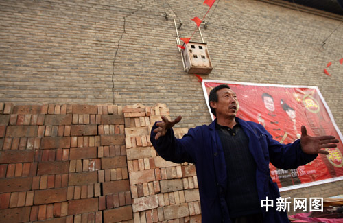 1月24日,万荣县通化镇张家院村一村民在介绍房屋遭地震裂缝情况。运城日报 薛俊 供图