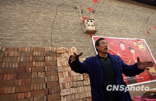 万荣县通化镇张家院村一村民在介绍房屋裂缝情况。中新社发 薛俊 摄