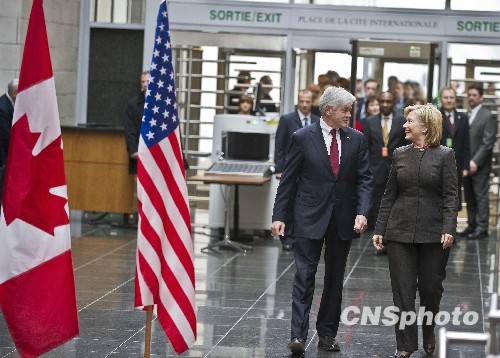 图为希拉里步入大楼,坎农迎接。中新社发 陈钢 摄