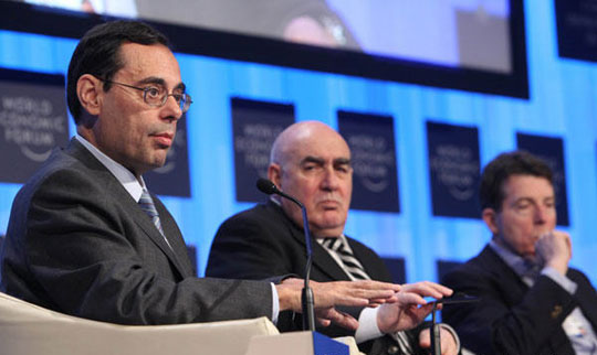 国际清算银行总经理海梅·卡鲁阿纳(左)等在瑞士达沃斯出席世界经济论坛年会。