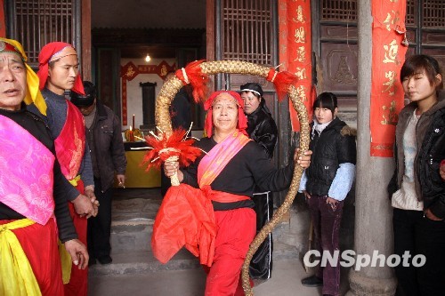 1月29日,河南省获嘉县杜官滩村上演精彩的“神马皮”表演。“神马皮”又称“马皮舞”,表演时由一人居中,展挥重约30斤、长7米的巨鞭绝技,八人扮马绕圈作舞。扮马者身背“将架”,“将架”上披红挂绿,并缀有数枚铜铃,叮当作响,意为“响马”已改邪归正。“将架”上描绘刘备、关羽、张飞、孔明、黄忠等诸将图像。中新社发 吕学杰 摄