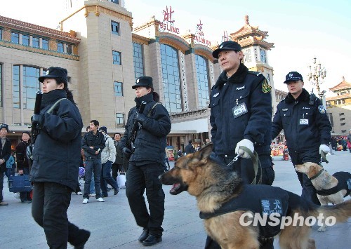 1月30日,一支民警巡逻队在北京站前值勤。当日是春运的第一天,在北京火车站内外,铁路警方不仅设置了全天候安检服务通道、还有特警携带警犬进行巡视,全面提升了处理突发事件的应急能力。中新社发 潘旭临 摄