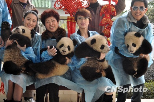 图为影片主创和熊猫宝宝亲密接触。中新社发 李学仕 摄