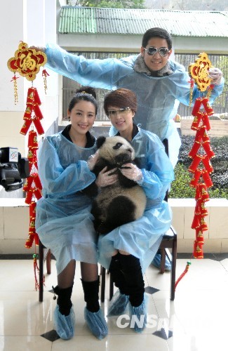 图为总导演陈晨、甘婷婷、金巧巧与可爱的熊猫一起向观众拜年。中新社发 李学仕 摄