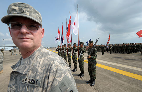 图:军演开幕典礼 美军大兵晕倒(3)