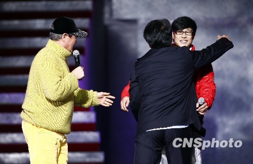 2月3日晚,成龙新片《大兵小将》迎春首映礼在北京举行,赵本山、小沈阳到场祝贺。图为成龙拥抱小沈阳。中新社发 杜洋 摄