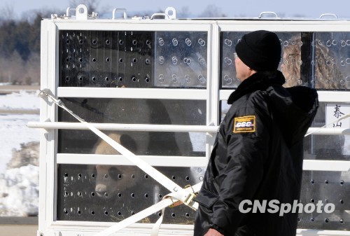 大熊猫“泰山”4日在华盛顿杜勒斯机场准备登上回国的“专机”,他将在中国开始新生活。中新社发 李静 摄