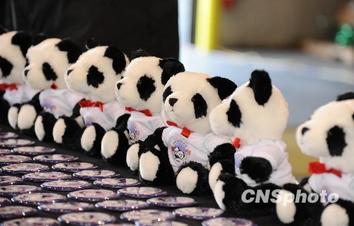 大熊猫“泰山”4日离开华盛顿准备在中国开始新生活。华盛顿杜勒斯机场摆上以“泰山”为原型的玩偶和徽章。中新社发 李静 摄