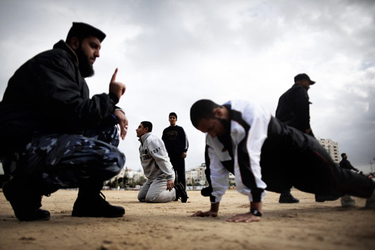 当地时间2月3日,加沙,巴勒斯坦哈马斯安全部队对前来应征的青年进行体能测试,此次招募共有数千名青年前来应征。