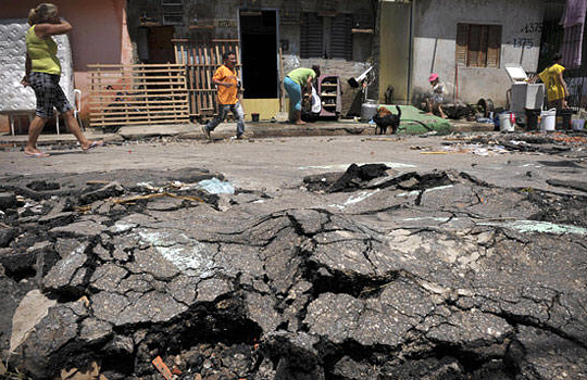 图为当地居民清扫被雨水毁坏的街道。