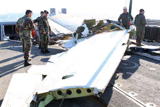 黎巴嫩士兵和国际调查人员在黎巴嫩海域检查打捞上岸的埃塞俄比亚失事客机的机翼残骸。